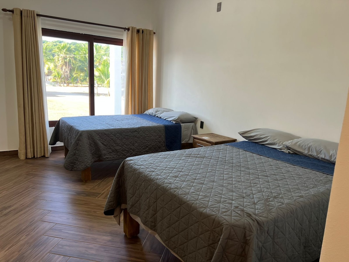 Casa ubicada a pie de playa, con 8 villas (departamentos), cada una con dos habitaciones con aire acondicionado y closet, baño completo con agua caliente, cocineta integral con frigobar y estufa, sala con tv con cable, wifi, áreas compartidas como terraza, alberca infinity con barra, espacios verdes y estacionamiento.