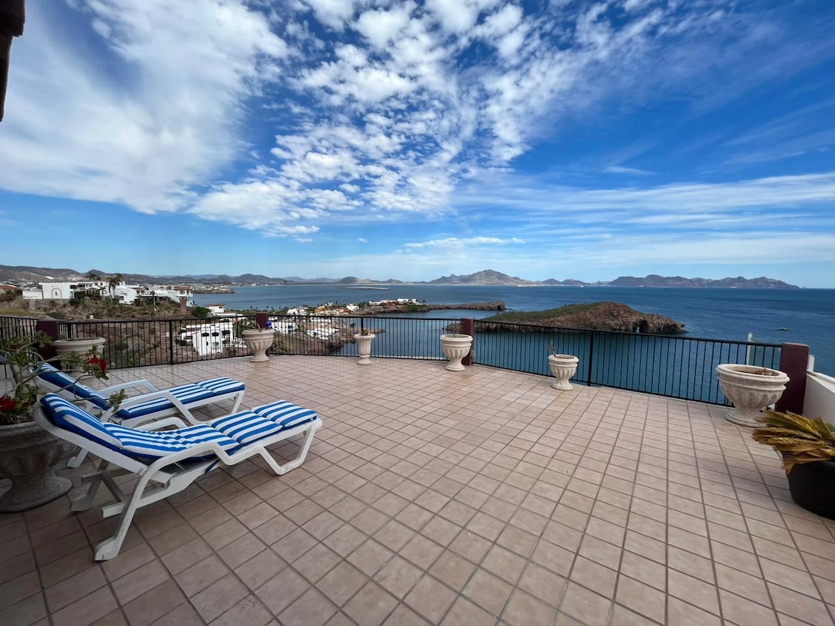 Vista del mar de Cortés, amanecer, puerto deportivo, ciudad. Cerca de tiendas, restaurantes y pubs locales. A pocos pasos del puerto deportivo y la playa de San Carlos. 4 dormitorios (una habitación pequeña con sofá cama), 3 baños completos, internet/wifi rápido y fiable de Starlink, sistema de purificación/ablandamiento de agua, aire acondicionado, calefacción, detectores de humo/monóxido de carbono, mesa de escritorio plegable, sistema de audio Bluetooth, PlayStation 3, cuna Pack 'N Play, silla alta. Cocina totalmente abastecida, murales/arte de estilo mexicano, fuente, balcón envolvente, limpio y acogedor.