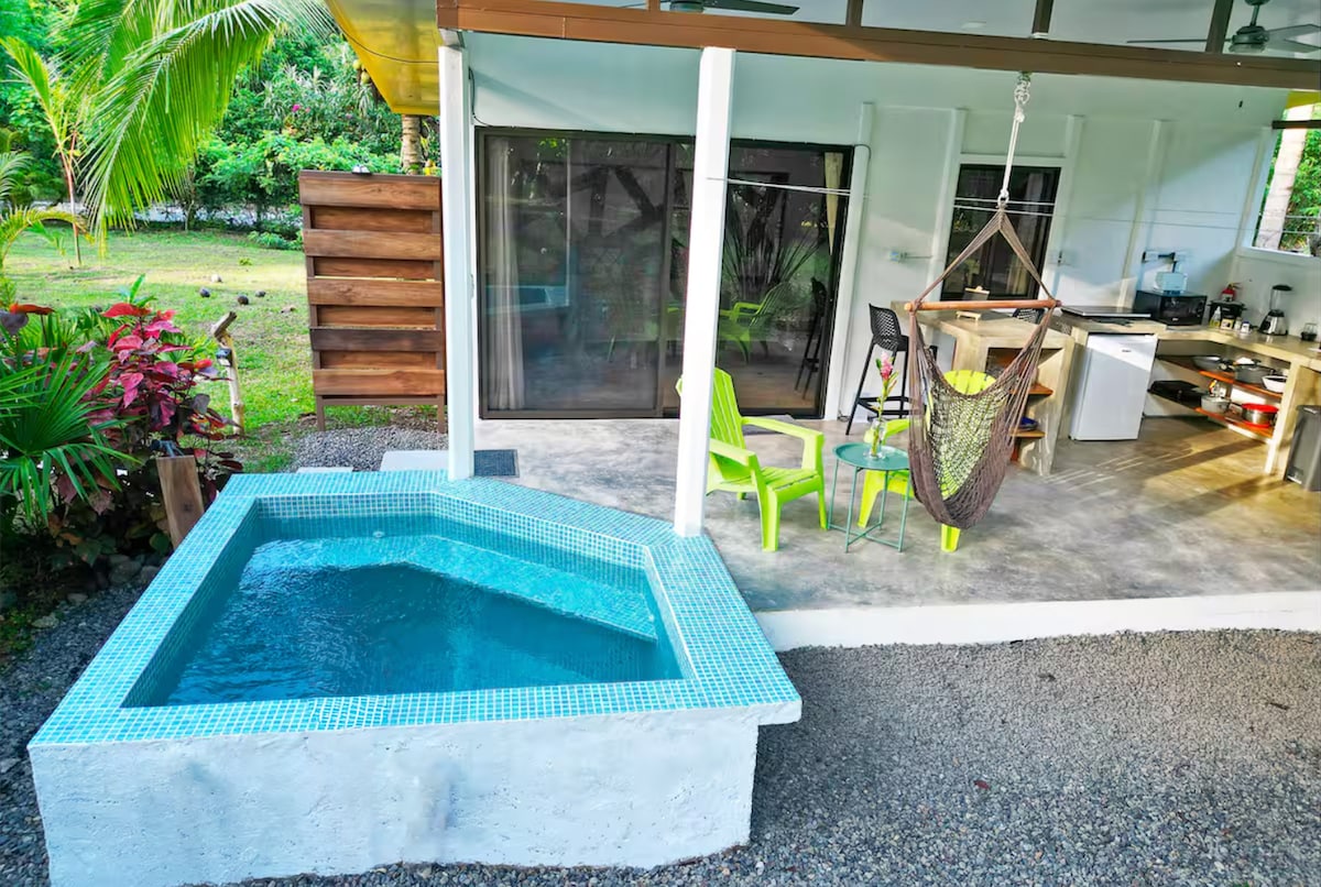 This purpose built Love Island themed casita is set in tropical gardens, minutes on foot from the National Park entrance, village center and some of Costa Rica's most beautiful beaches. This stand alone studio unit features A/C, its own private plunge pool, a dedicated work space and 25mb wifi speed for digital nomads, a fully equipped modern kitchen, stylish bathroom suite, and off road private parking. Watch sloths, toucans and howler monkeys while relaxing in your own luxurious dip pool!