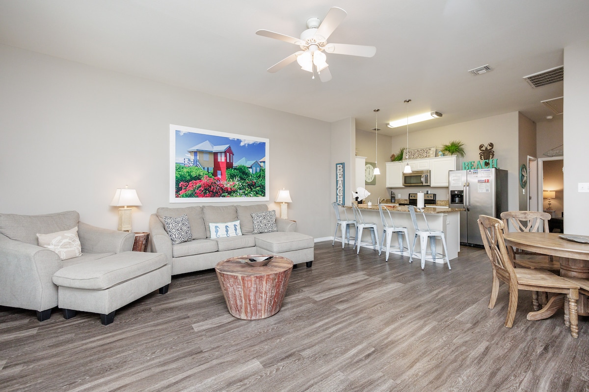 Nuestra unidad de 1 piso está a poca distancia en coche de la playa (0,5 millas), tiendas, restaurantes y el centro de la ciudad. ¡Este apartamento de 3 dormitorios y 3 baños lo tiene todo! Hay 2 suites principales con camas tamaño king, un tercer dormitorio con un juego de literas y una cama alta, y otro juego de literas escondido en un rincón del pasillo. La cocina está equipada con platos, electrodomésticos y todo lo que un cocinero podría necesitar. ¡Lavadora/secadora en el alojamiento! ¡2 piscinas tropicales y un parque infantil para los niños! Gran patio cubierto y protegido. 2 plazas de aparcamiento justo fuera de la unidad.