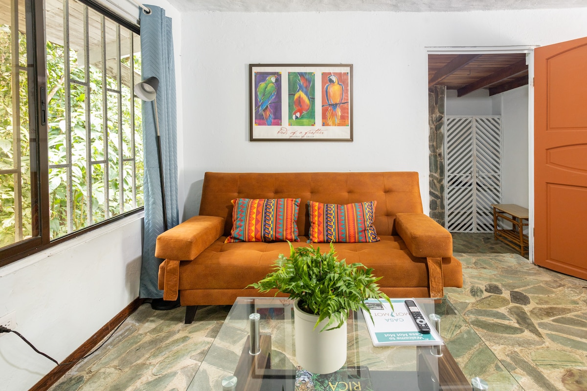 Casa Blue Rock Departamento en un primer piso hecho con amor con la mayor atencion para los detalles , con un gusto moderno y un estilo minimalista limpio lleno de luz. Una amplia sala con tres colchones cama, TV con cable internet 10 mega con WI FI ,con cocina una mesa de 5 lugares, baño privado con panel de ducha con hidrojets de masaje. Una recamara privada donde sale de el piso la famosa roca azul, con una cama King . Aire acondicionado y dos ventanales enormes con vista al bosque lluvioso