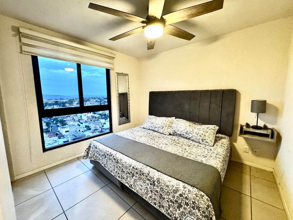 Cómodo departamento, privado, tranquilo, cercano a terraza oblatos y punto oriente, dentro de la ciudad, todos los servicios cercanos (bancos, supermercados, centros comerciales, iglesias, comida). Áreas verdes comunes, vigilancia y estacionamiento. Hermosa vista panirámica En estancias mayores a 30 dias el hospedaje es compartido con una persona, habitaciones independientes.