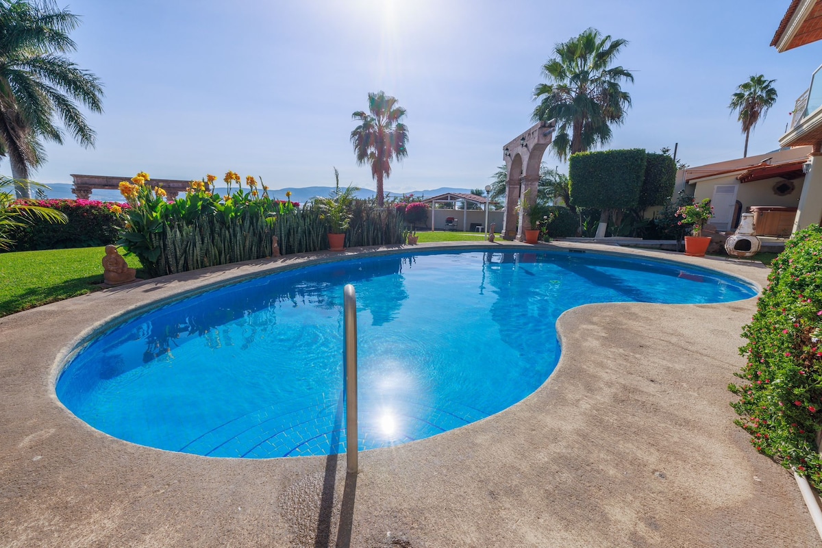 Vista Infinita Una hermosa casa moderna con amplias vistas al sur del lago Chapala. La decoración es mexicana contemporánea. Gran privacidad entre dormitorios, cada uno con su propio baño de lujo. Gran despensa y garaje para dos coches. Cocina bien equipada con placa de gas. Barbacoa. Fácil acceso, sin escaleras. Piscina infinita de 13 metros y jacuzzi spa: ¡climatizado! Chimenea de gas. Pantallas a través de grandes puertas correderas de funcionamiento suave. Ropa de cama de lujo, toallas blancas y mullidas como en un spa. ¡Artístico y decorativo!