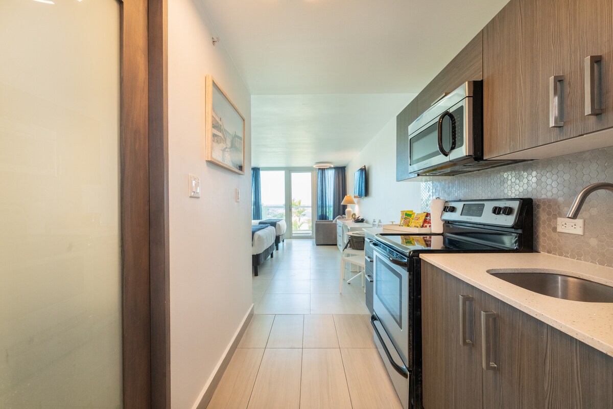 Ubicación privilegiada frente al mar, a solo 4 minutos en coche del aeropuerto internacional. Junto a hoteles de lujo, este estudio ofrece fácil acceso a restaurantes, una farmacia abierta las 24 horas y tiendas de comestibles. La playa está justo fuera de tu puerta. Recientemente remodelado, el estudio cuenta con una cama tamaño queen y un sofá cama completo. Disfruta de las comodidades de un hotel de primera categoría, como piscina, gimnasio y centro de lavandería abierto las 24 horas. La cocina completa y la encantadora mesa de comedor ofrecen vistas al mar y a la selva tropical.