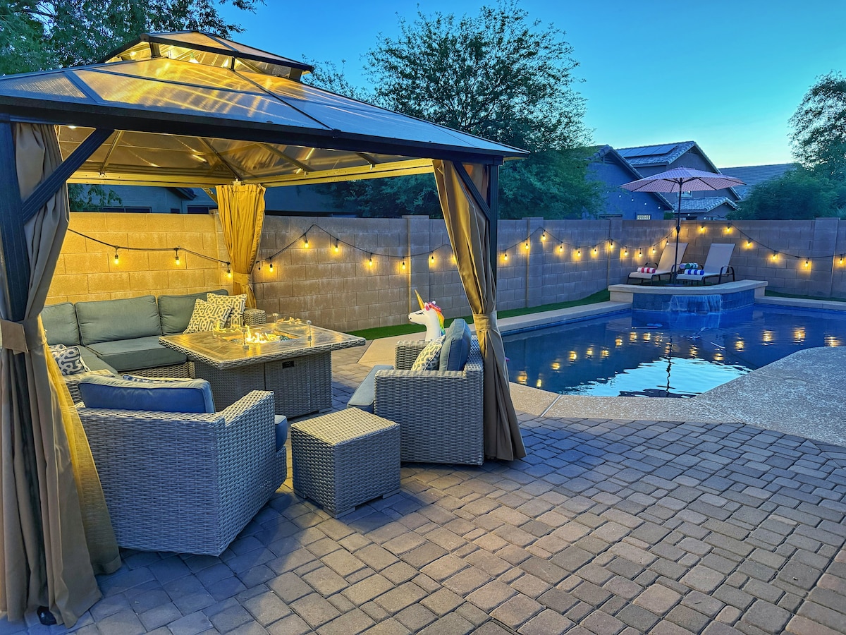 - Cama tamaño king - Chimenea exterior - Wifi de alta velocidad. - Cocina de chef - Bañera de hidromasaje. Cuando entres en esta serena casa de Queen Creek, te encontrarás con un enorme concepto abierto. La cama tamaño king de lujo te adormecerá justo después de darte un baño caliente en la bañera gigante. Siéntate junto a la chimenea de gas al aire libre para calentarte y luego relájate en el jacuzzi inflable para 2-3 personas. Barbacoa de gas al aire libre y cocina interior totalmente equipada. La piscina comunitaria está justo al final de la calle. La piscina no está climatizada.