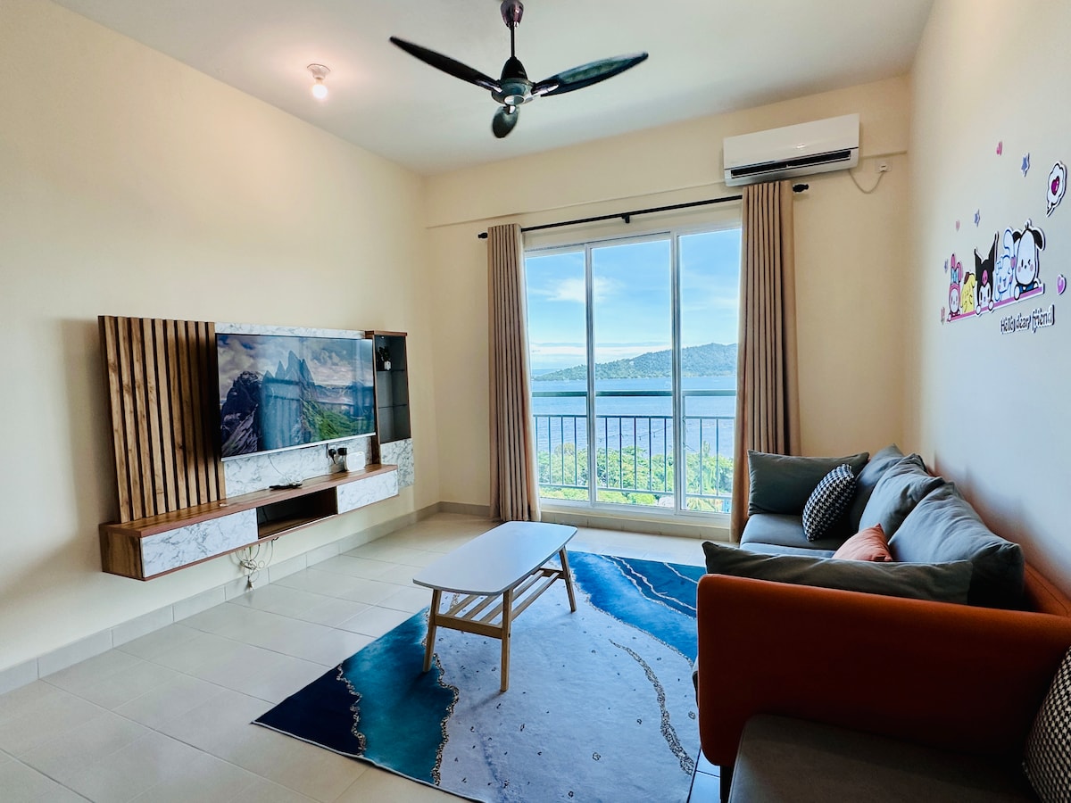 Home_163 Sandakan Living room with aircon & fan 2 bedroom and 2 bathroom Sea View -Master Bedroom with aircon 1 queen size bed -Bedroom 1 with aircon 1 queen size bed + single bed Fully furnished come with -WIFI / TV Box -Washing machine / Refrigerator -Dinning table -Water heater -Coway water purifier -Hair dryer build in both bathroom -Two way induction cooker -Two car park #No pool Check In - 3pm Check Out - 12pm No pet allowed No durian No smoking indoor Allow smoking at balcony