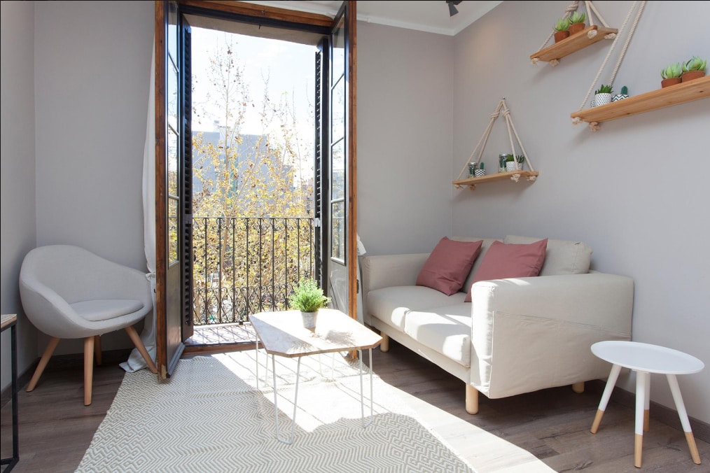 Moderno apartamento de un dormitorio y un baño en el céntrico barrio de Sant Antoni, ideal para un grupo de máximo cuatro personas. El dormitorio cuenta con una cama doble y también hay un sofá-cama en el salón, que puede alojar a dos personas más. El apartamento compagina suelos de madera con una decoración moderna, además de disfrutar de mucha luz natural. También encontrarás un comedor con una mesa grande, para poder disfrutar tranquilamente de tus cenas en el apartamento.