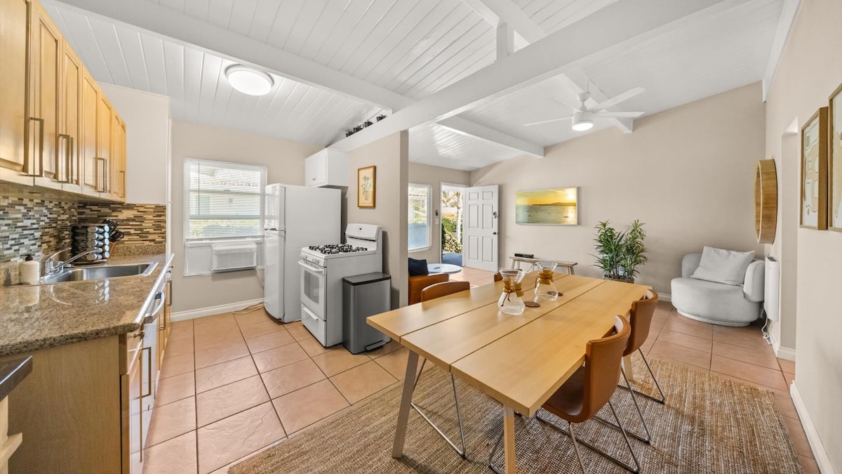 ¡Escondido en un patio tropical, este apartamento de 1 dormitorio totalmente renovado con cocina completa y sala de estar tiene todo lo necesario para tu próxima escapada a SB! Cama Casper tamaño king con ropa de cama de calidad hotelera, productos de baño de artículos públicos y toallas Ralph Lauren. Cocina totalmente equipada, sala de estar con un cómodo sofá y TV de pantalla plana de 48pulgadas. Servicio de té y café. Se admiten mascotas y estacionamiento privado gratuito. ¡Sé una de las primeras personas en alojarte en este apartamento recientemente remodelado!