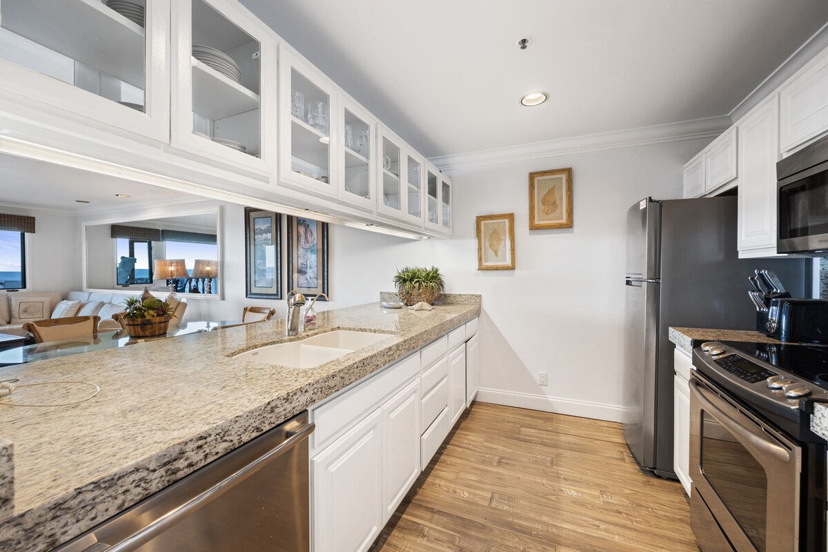 Departamento de un dormitorio totalmente remodelado con cama king. Espectacular vista al mar y un automóvil eléctrico de 4 plazas completamente nuevo. Una cocina totalmente equipada con electrodomésticos nuevos y una cafetera Keurig con café incluido. Sofá cama queen en la sala de estar, chimenea y calentadores de pared. El balcón tiene una parrilla. Servicios: Gimnasio, piscina climatizada, spa, campo de putting de 18 hoyos, canchas de tenis, cancha de croquet, voleibol de playa y playa con parrillas y mesas de pícnic integradas. ¡Los ocupantes están sujetos a las normas de la asociación de propietarios!