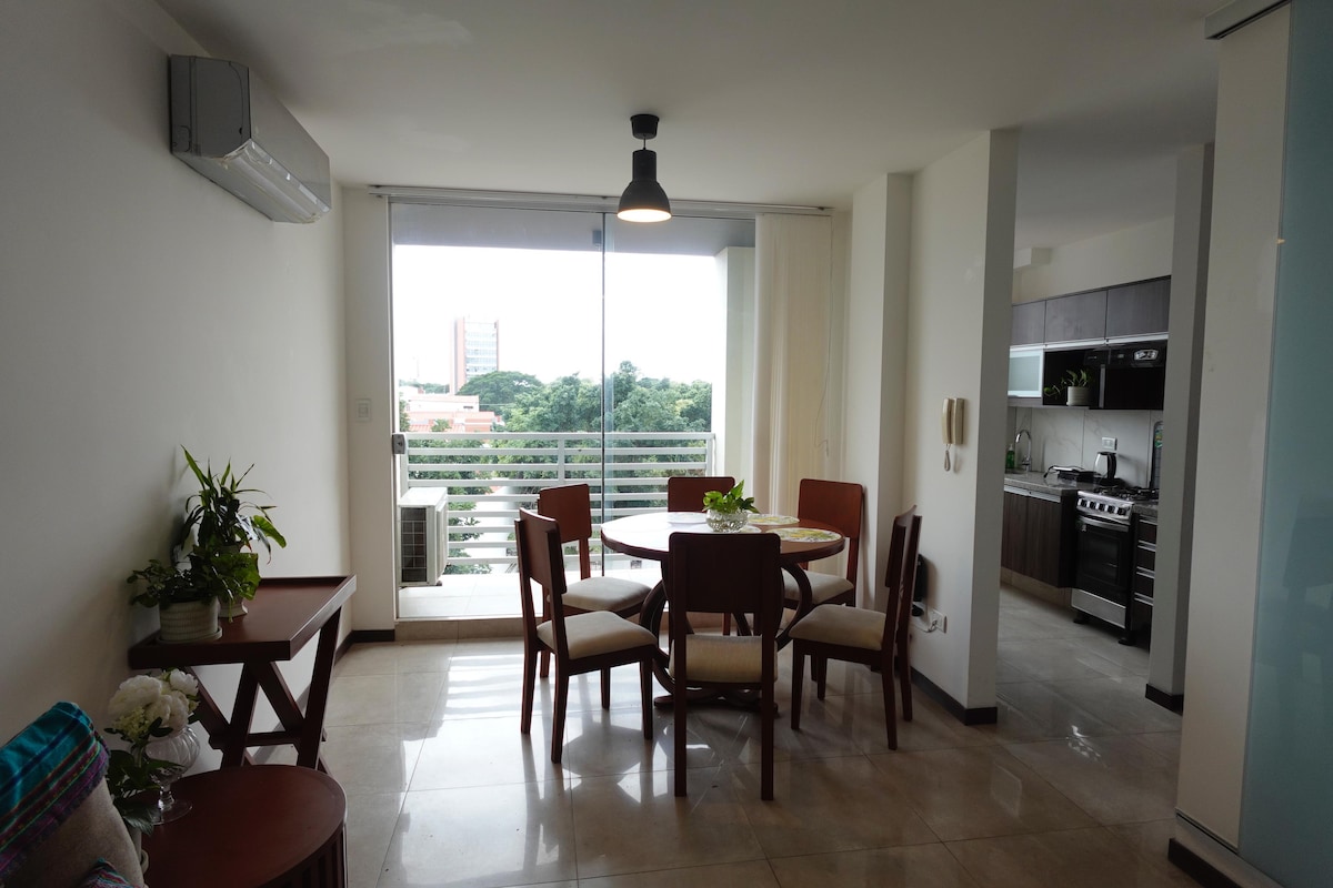 Ubicado en una tranquila zona residencial de la ciudad, a unas cuadras de la avenida Cristo Redentor (también conocida como Banzer), la calle principal de Santa Cruz. Este apartamento estudio es acogedor, tiene electrodomésticos esenciales, un balcón y aire acondicionado que también puede actuar como calentador que es muy bienvenido en los pocos días fríos de invierno. Cuenta con instalaciones inmejorables: gran piscina, gimnasio completo, sauna, pequeños cines, sala de juegos, lugares para barbacoas y estupendas vistas de 360 grados de la ciudad en lo alto del edificio.