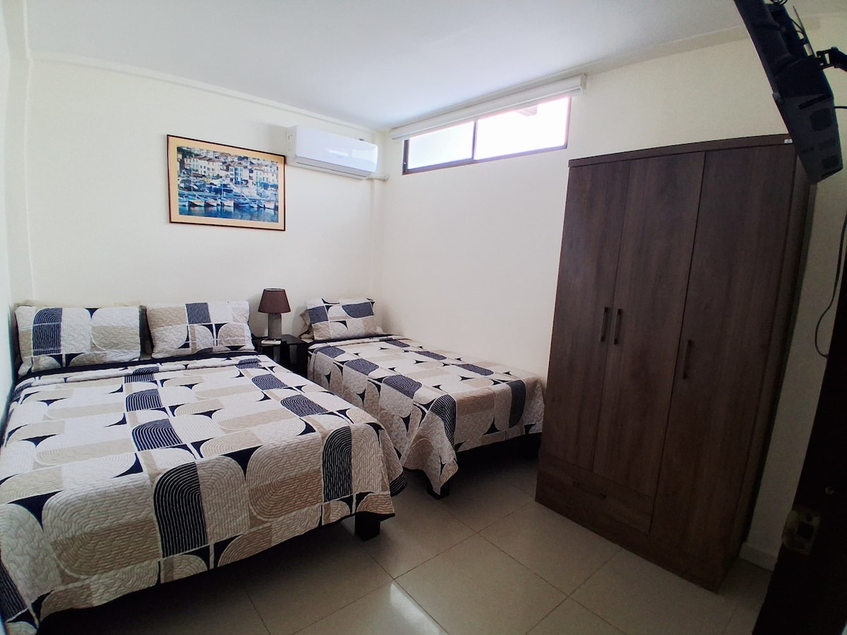 Disfruta de un hermosa suite nueva, con una habitación con cama queen size (2 1/2 plazas) closet, A/C split, baño privado especial para adultos mayores, cocina equipada full y sala con un sofá cama de 1 plaza y media y otro de 1 plaza. A/C split, TV con DVD player y servicio de TV por cable, con todas las comodidades, garaje, wifi, y dentro de una ciudadela cerrada y segura con guardianía 24/7, con acceso a piscinas y canchas de la urbanización y a 5 minutos de las playas de Punta Blanca.