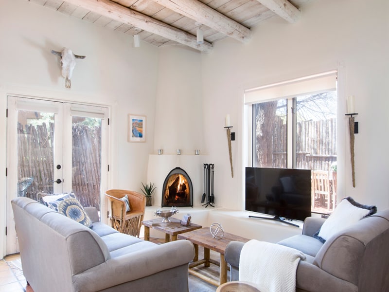 The Rio Vista Complex is in the Heart of the historical eastside of Santa Fe, adjacent to the Santa Fe River, and just a block from Canyon road. This cozy condo with an open floor plan featuring a double sided gas fireplace between the bedroom and the living room providing light and warmth throughout the house. The bedroom has a walk in closet with ample storage and a washer & dryer. Our condos are sparkling clean and undergo stringent sanitizing and disinfectant procedures.