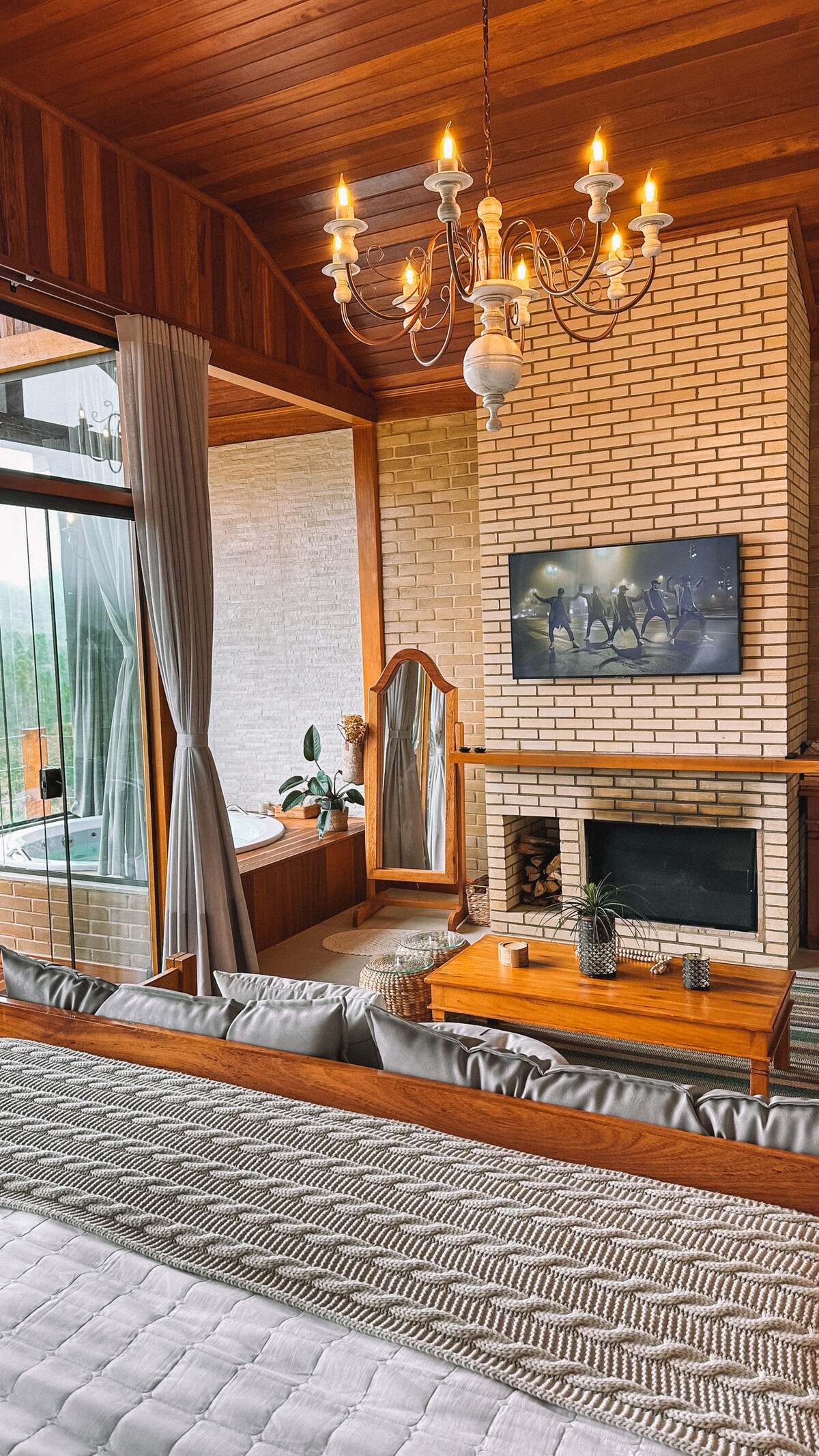 Um refúgio onde a arquitetura e o design se encontram para celebrar a simplicidade e a conexão com a natureza. O uso de madeira e iluminação suave criam um ambiente que acolhe e convida à introspecção. Cada detalhe fala de harmonia: linhas retas e orgânicas se misturam para dar forma a um espaço que não é apenas para estar, mas para ser. Nesta hospedagem, o espaço transcende o físico e se torna um convite ao repouso da alma, onde o simples ato de estar ali é uma celebração do tempo presente.