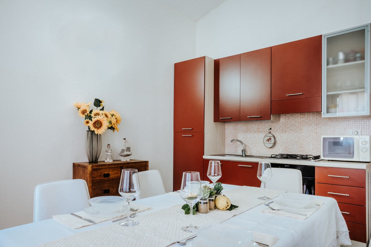 Casa de vacaciones situada a pocos pasos del puerto, de la plaza y a 10 minutos de la playa de Sottotorre. El alojamiento está situado en el primer piso de una casa recientemente reformada y consta de cocina, sala de estar con sofá cama y TV, un baño, un dormitorio doble, un dormitorio con una cama individual y zona de lavandería. La cocina da a una terraza equipada con mesa, sillas y tumbonas. La sala de estar está equipada con aire acondicionado.