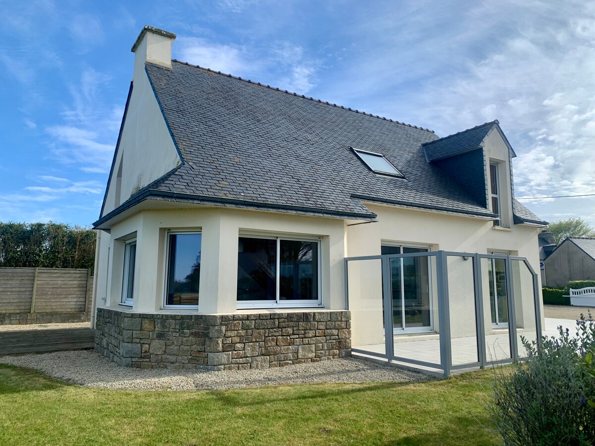 Superbe maison proche de la mer (5 min en voiture), au calme avec son séjour plafond cathédrale. Au RDC, une suite parentale, un WC séparé, une cuisine équipée et un très beau séjour salle à manger. à l'étage, une mezzanine comprenant un salon et un espace chambre avec un lit simple, une chambre composée de deux lits, un simple et un double. Venez vous ressourcez en Bretagne! Pensez à apporter vos draps et serviettes de toilette, 1/2 Torchons. Vous ferez le ménage avant de partir.