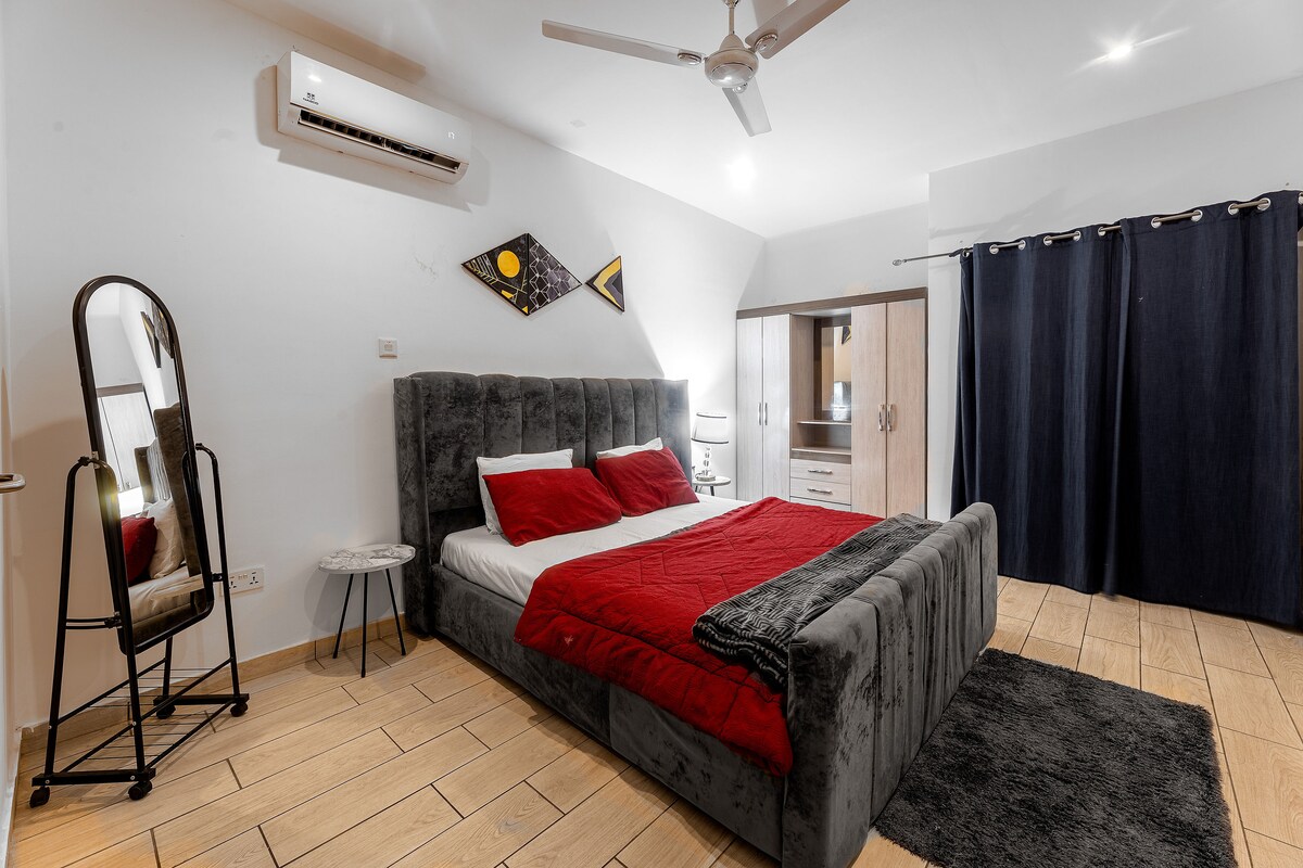 Disfruta del lujo moderno y la comodidad tranquila en Borteyman Luxe Escape. Ubicado en los tranquilos y seguros apartamentos Borteyman SSNIT, este elegante apartamento de 1 dormitorio ofrece 1,5 baños, una cocina totalmente equipada, lavadora, dos aires acondicionados, un armario personalizado y un escritorio de trabajo dedicado. A solo 20 minutos en coche del Aeropuerto Internacional de Kotoka, es perfecto para viajeros de negocios, trabajadores remotos o una escapada relajante. Disfruta de un registro de entrada autónomo sin complicaciones, wifi rápido y fácil acceso a los mejores lugares de Accra.