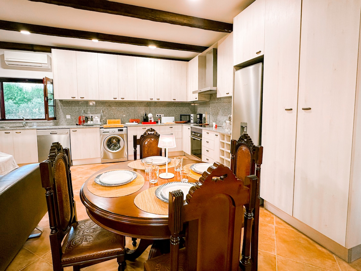 A place where waking up is accompanied by birdsong and the swaying of trees, airy and quiet, exuding tranquility. In the heart of the Alentejo, 90 minutes from the capital and three minutes from the center, surrounded by vineyards, this charming modern vintage-style village house offers magnificent views of the Alentejo plain, providing a peaceful and comfortable stay with access to cable channels and free Wi-Fi, bedroom and living room with air conditioning and wood-burning stove.