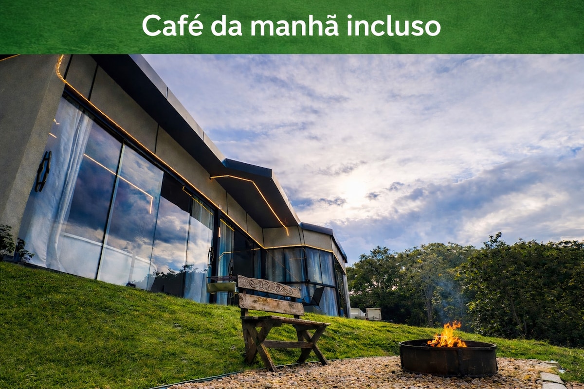 Cabana de Vidro com Sauna e Vista das Montanhas