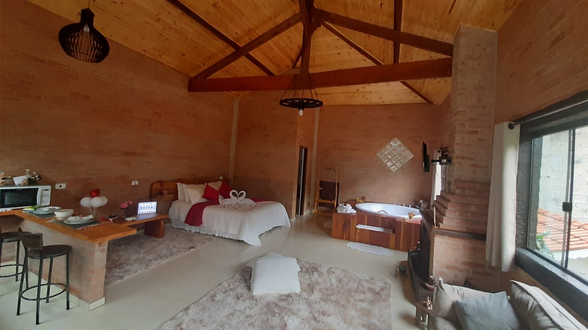 Chalé Crystal muy cerca del centro . Bañera con cromoterapia En un lugar rodeado de naturaleza , muy acogedor, tranquilo es muy reservado Cama matrimonial de tamaño estándar Con ropa de cama , almohada , toallas cubiertas y toallas. Todos los cubiertos de utensilios de cocina,sandwichera, licuadora,cafetera y olla de fondue, el aire acondicionado solo para la calefacción no se libera función de calefacción para esto. Tenemos chimenea.