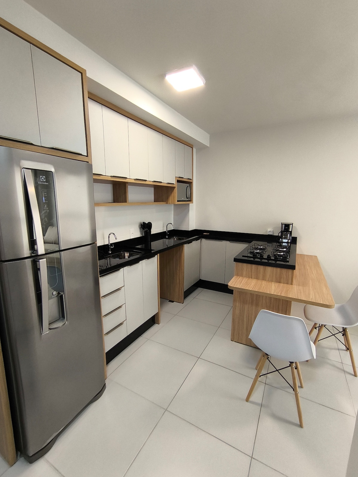 Studio de 49m2, sem divisórias, com sacada, wi-fi, SmartTV, sofá retrátil, cozinha com cookietop, forno, micro-ondas, filtro, geladeira, jogo de panelas, talheres, cafeteira, liquidificador, sanduicheira, copos/taças, tábua de passar e varal de chão. Cama queen, lençóis, toalhas, ar ❄️ e 🔥, armário p/ 2 e cortinas blecaute. Tem ferro de passar e secador. Garagem privativa p/ 1 carro. Home office com iluminação! A 2 quadras de supermercados, cafés, farmácias, bares, restaurantes e academias.