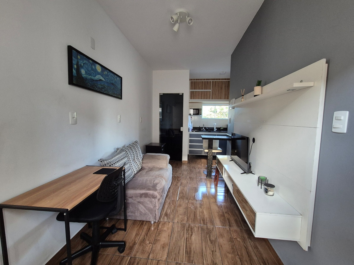 Nunca olvidarás este acogedor apartamento con dormitorio en suite y cocina, ideal para aquellos que buscan practicidad y comodidad. El apartamento 013 está frente a la propiedad, en un conjunto de cuatro apartamentos adosados, lo que garantiza un ambiente tranquilo. Tiene una vacante privada. Cerca de Unisul, Passeio Pedra Branca y Shopping Via Catarina, con fácil acceso a la BR-101. El apartamento está a 17 km del centro de Florianópolis y a 25,5 km del aeropuerto Hercílio Luz. Disfruta de tu estancia en este espacio único.