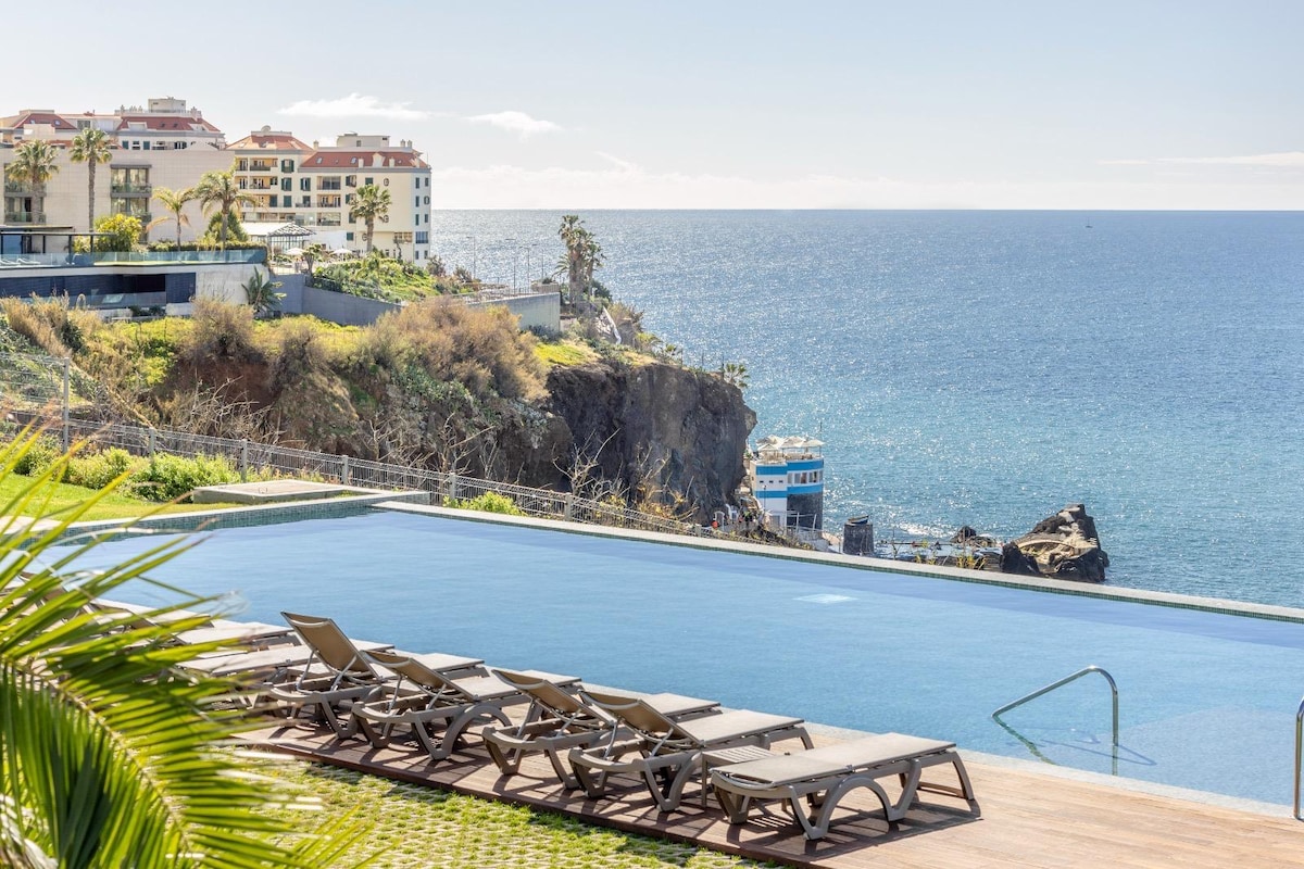 Nueva unidad de lujo moderna de 2 dormitorios en Madeira Acqua Residence con vistas al mar de 180 grados sin obstáculos desde su espacio de estar y camas. Ropa de cama de lujo, SmartTV de 86 pulgadas, cocina completa con lavadora/secadora. Lugar muy tranquilo con seguridad y excelente ubicación: al otro lado de la calle supermercado Continente y a pocos minutos a pie del centro comercial Madeira Forum y Pingo Dolce + muchos restaurantes. Ascensor a la playa pronto. Espacio ajardinado exterior sereno con zonas de estar. 2 plazas de aparcamiento. Piscina infinita + gimnasio.