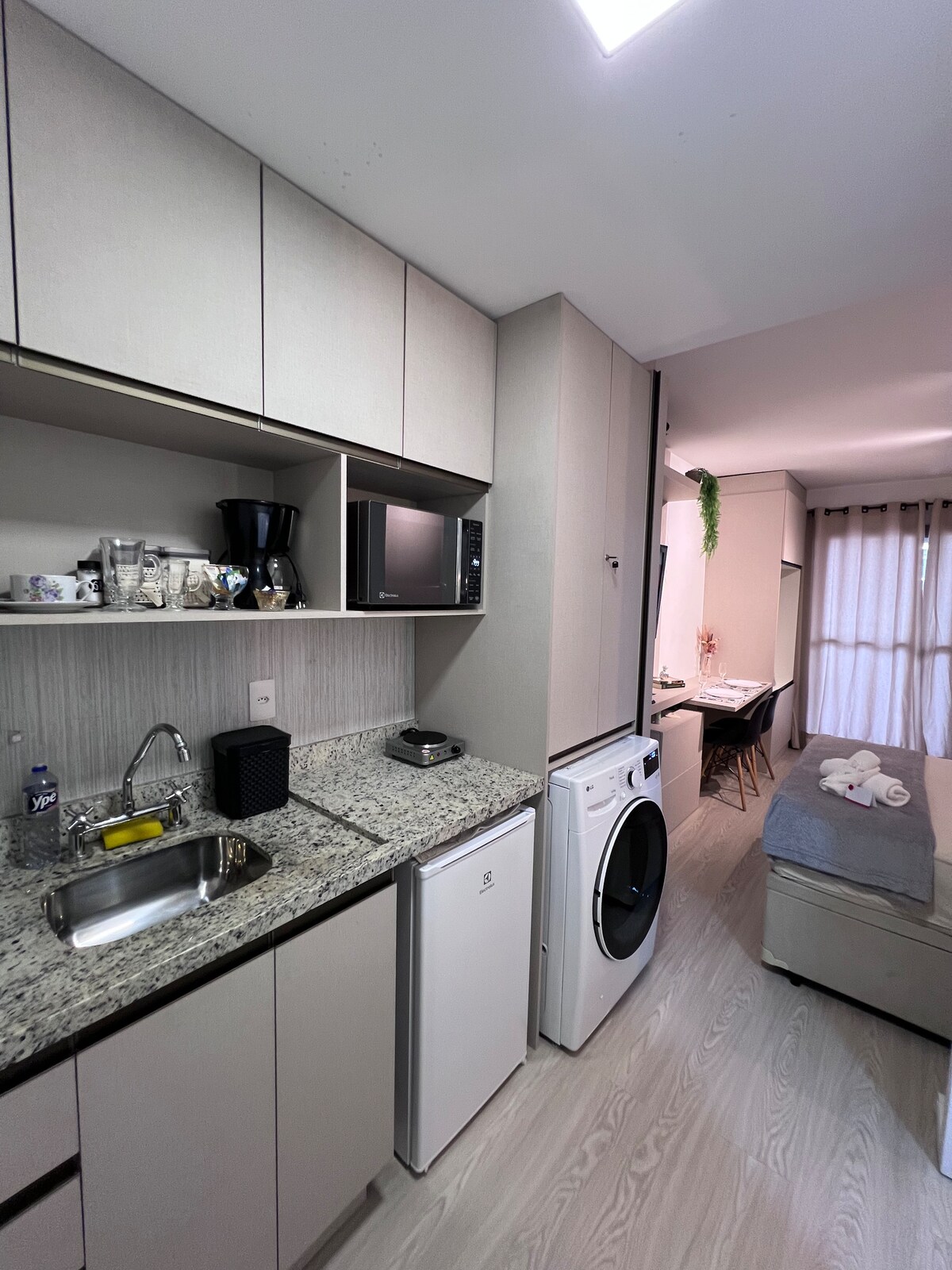 Departamento tipo estudio totalmente equipado con check-in las 24 horas, los 7 días de la semana, ideal para hasta 3 personas. **Indique el número de huéspedes antes de reservar. Cuenta con aire acondicionado, televisión inteligente, cama matrimonial, cama nido, microondas, mesa, sillas, vajilla, cubiertos, vasos, cafetera, filtro de agua fría y natural, toallas, sábanas, cobijas, almohadas y secador de pelo. 100 metros CEIC A 200 metros del metro de Conceição. 1 cuadra de Pan de Azúcar y Carrefour 500 metros de restaurantes Expo São Paulo a 3 km Aeropuerto de Congonhas a 4 km.
