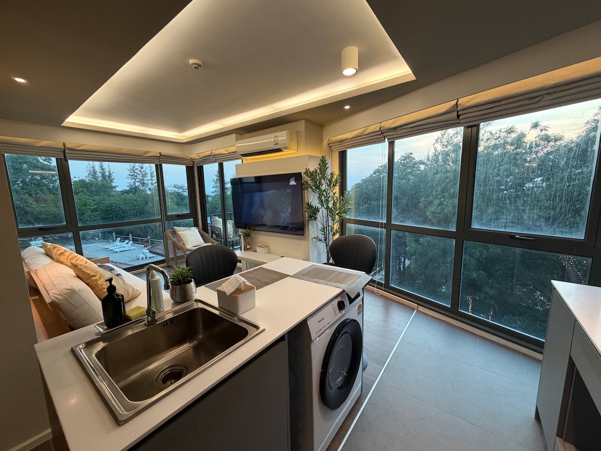 Este es el gran complejo de condominios con sistema de agua de Pattaya, el secreto más lujoso de Pattaya.Disfruta de una playa privada, lejos del ajetreo y el bullicio.Saluda al amanecer y abraza el atardecer frente al mar infinito.No eres un transeúnte, sino el único y eterno maestro de la puesta de sol sobre el mar ~ La comunidad tiene un gimnasio, baño de aguas termales, gran piscina con cascada al aire libre, tobogán giratorio para niños, oficina compartida, sala de juegos, sala de billar, sala de juegos para niños, sala de boxeo tailandés, sala de yoga, restaurante, el parque es muy verde, el entorno es hermoso, espero que tengas un recuerdo maravilloso.