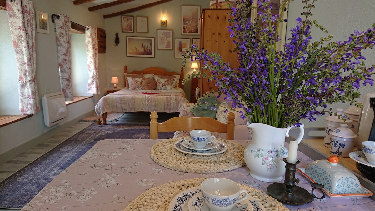 Recientemente reformado, conservando su encanto rústico tradicional, el lugar perfecto para relajarse y desconectar. Cuenta con entrada propia, cocina, comedor y sala de estar con chimenea de piedra original de Charantais y un dormitorio con baño privado. Los grandes ventanales aprovechan las impresionantes vistas al campo y los espectaculares amaneceres. Si eres un fan de la vida silvestre, no te decepcionarán los visitantes habituales de ciervos, ardillas rojas, grullas migratorias y una de nuestras favoritas, la abubilla.