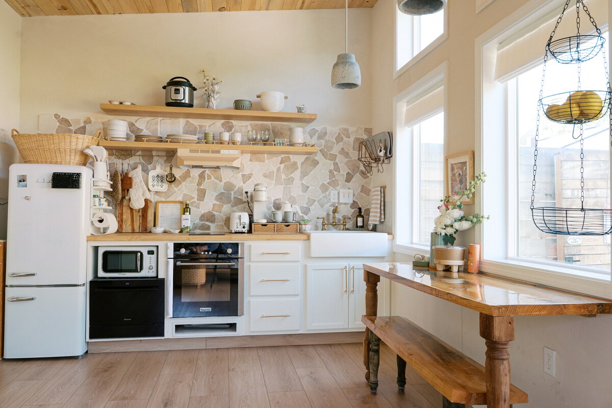 This 400 square foot tiny house was created for comfort and convenience. It is a studio layout with a shared space for living and sleeping but still offers a full kitchen, bathroom (with tub), washer, dryer and dedicated off street parking. A light filled space with vaulted ceilings, it is ideal for both short term and longer term stays. It offers modern, designer decor including white subway tile and open shelving in the full kitchen, high thread count sheets and white duvet on a comfortable mattress and some colorful spanish tile in the bathroom. It feels like a quiet, private retreat, but yet, it's close enough to Old Town Clovis to walk to everything. Come and enjoy! You have complete access to this home. You check in and out independently with this house. But, if anything is needed myself or my co-hosts are available to assist. The house is located in the charming, historic downtown district known as Old Town Clovis. You can easily stroll to nearby shops, restaurants, and festivals. Running and walking trails are also nearby. Big box stores and supermarkets are a few minutes' drive away, and the airport can be reached in 15 minutes. There is easy access to Highway 168 which connects you to attractions such as Yosemite and Sequoia National Parks. This home has one dedicated off street parking spot on the side of the property. Taxis are available and there is a bus stop within a 20 minute walk. But, people typically drive when visiting the area. There is WiFi and a smart TV. You can watch personal subscriptions (Netflix, Roku, Hulu, etc). But there is no cable TV. This is an alley facing home where your "view" will be garages and fences. While there are parks and trails within easy walking distance, there is no yard or outdoor space with this house (with the exception of the small front patio). There is a main house facing the street that is separated by privacy fencing. You access your home via the rear alley behind the main house and have one dedicated parking spot. If you have more than one vehicle you will need to park those additional vehicles on the street.