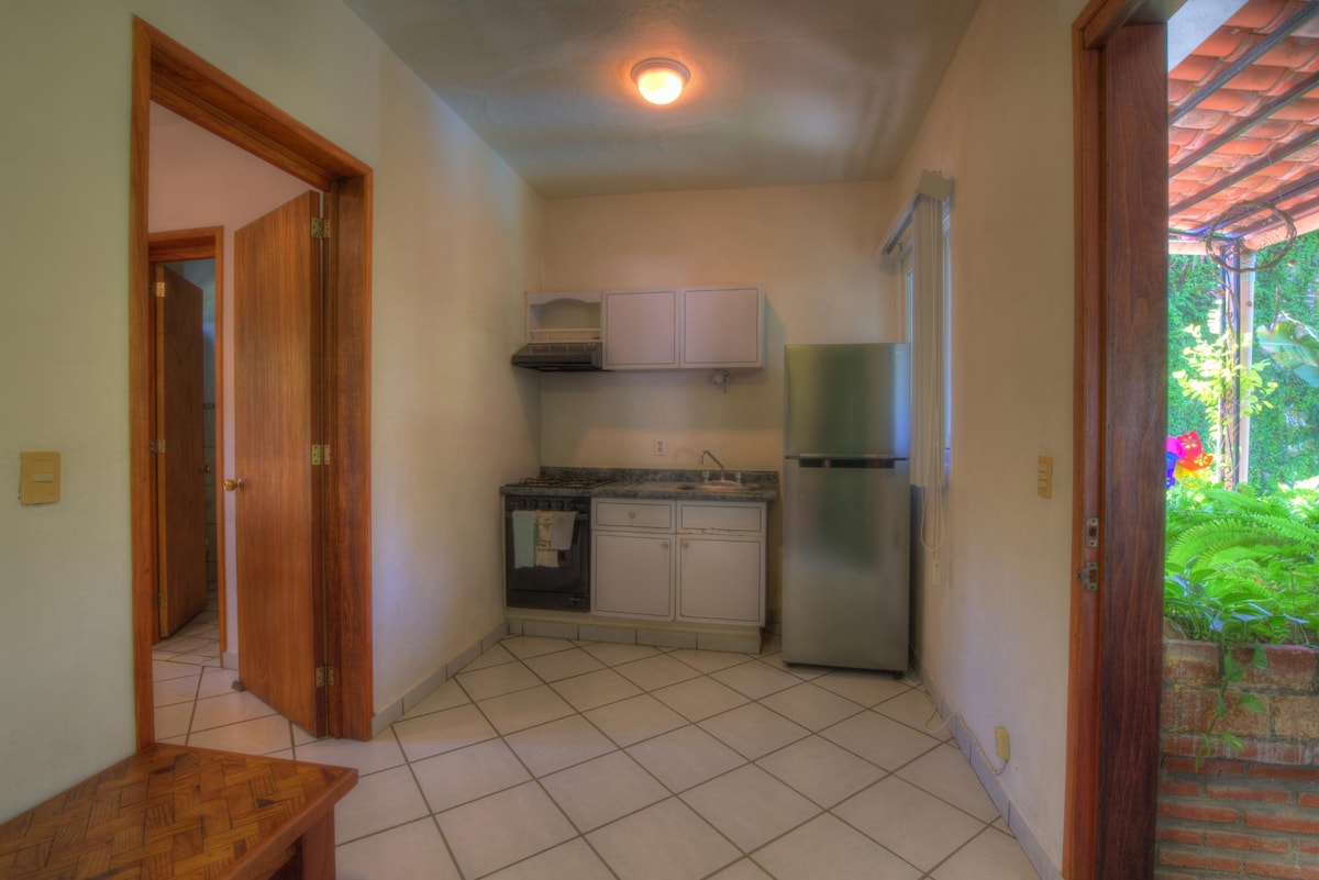 Very small, cozy unit with one Queen bed. It is surrounded by garden at the far back of our property with 6 more units in the front part that all together make up our "Sayulita Oasis". It has a private en-suite bathroom. Please note that it does not have a kitchen / fridge. Feel free to use the small, shared dipping pool in the front area. Also, please look at the last photo. It shows and describes the layout of the whole property and all it's casitas and common areas like pool or gardens.