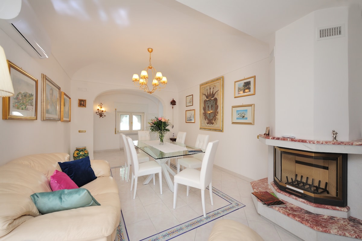 Villa San Giuseppe es una encantadora casa unifamiliar de 120 metros cuadrados, con capacidad para siete personas, que se encuentra en Furore, un pequeño pueblo en la costa de Amalfi considerado uno de los pueblos más bonitos de Italia. Está rodeada de naturaleza, tranquilidad y paz que siempre atraen a personas que buscan relajación. La villa tiene tres dormitorios dobles (uno de ellos tiene una cama individual de 80 cm/32 pulgadas además), dos baños, una cocina, una sala de estar, un comedor y una chimenea. Los dormitorios son muy espaciosos (las camas son de 160 cm, más anchas que una cama tamaño queen) y dos de ellos, junto con la sala de estar, están expuestos a la larga terraza con vistas al mar donde puedes sentarte y tener una vista panorámica del mar y de las pintorescas colinas de Furore. El tercer dormitorio está expuesto a la pequeña terraza lateral y tiene un baño privado, equipado con un lavabo, un inodoro, una bañera con cabezal de ducha fijo, un secador de pelo de pared y una lavadora. El otro baño está equipado con un lavabo, un inodoro, una bañera con cabezal de ducha fijo y un secador de pelo de pared también y está frente a las habitaciones junto al mar. La sala de estar es elegante y cómoda y está provista de un sofá, dos sillones, una mesa ajustable para siete personas, TV vía satélite, reproductor de DVD, equipo de música, algunos juegos de mesa y una estantería que ofrece una variedad de libros en diferentes idiomas. La cocina está totalmente equipada con una cocina de gas de cinco quemadores, un horno eléctrico/de gas, una nevera con congelador, dos cafeteras de estilo italiano, un hervidor de agua, una tostadora, un exprimidor de naranjas y todo lo que necesitas. También hay una selección de vinos elaborados a partir de viñedos locales, famosos en todo el mundo. Podrás entrar en el comedor desde la cocina. La mesa del comedor tiene capacidad para siete personas. En esta habitación encontrarás un piano digital. La habitación tiene una gran ventana panorámica con vistas al mar y a la costa. Desde la cocina, una puerta francesa te llevará al jardín (50 metros cuadrados/540 pies cuadrados de largo), parcialmente cubierto con una «pérgola» de plantas de uva, kiwi, un limonero y un mandarino. Desde aquí podrás disfrutar de la vista del mar y de la costa sentado en una tumbona o en la mesa de piedra de lava, ejemplo de la famosa cerámica de Vietri, donde podrás disfrutar del desayuno, el almuerzo o la cena con absoluta tranquilidad.
