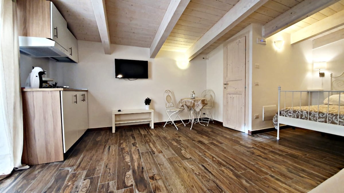 Elegante ático situado cerca de la calle principal de la encantadora Gaeta, la perla del golfo del mismo nombre. La ubicación del apartamento es a la vez céntrica y alejada del ruido de la ciudad, para garantizar una relajación absoluta. En la planta baja, en el patio con puerta automática, nuestros huéspedes tienen a su disposición una cómoda plaza de aparcamiento a la sombra. El punto fuerte del ático es, sin duda, su terraza con una vista impresionante del golfo. Os esperamos