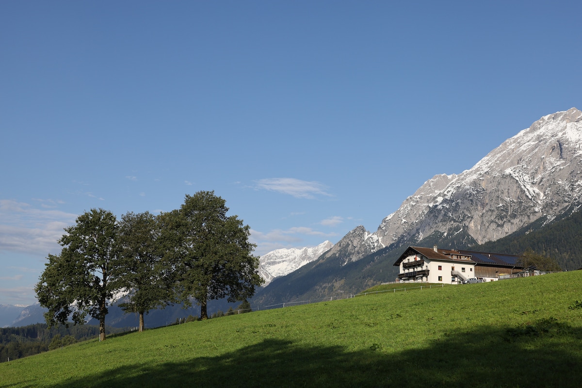 El departamento vacacional está en una fantástica posición panorámica en la meseta alta de Gnadenwald en una granja idílica. Rodeado por el impresionante paisaje montañoso de los Alpes Tiroles, ofrece el refugio perfecto para los amantes de la naturaleza y aquellos que buscan relajarse. Directamente desde la puerta principal, puedes hacer largas caminatas y caminar por el Parque Natural Karwendel. Se puede llegar a Haller Altstadt en unos 20 minutos en coche y a la capital del estado de Innsbruck en 30 minutos.