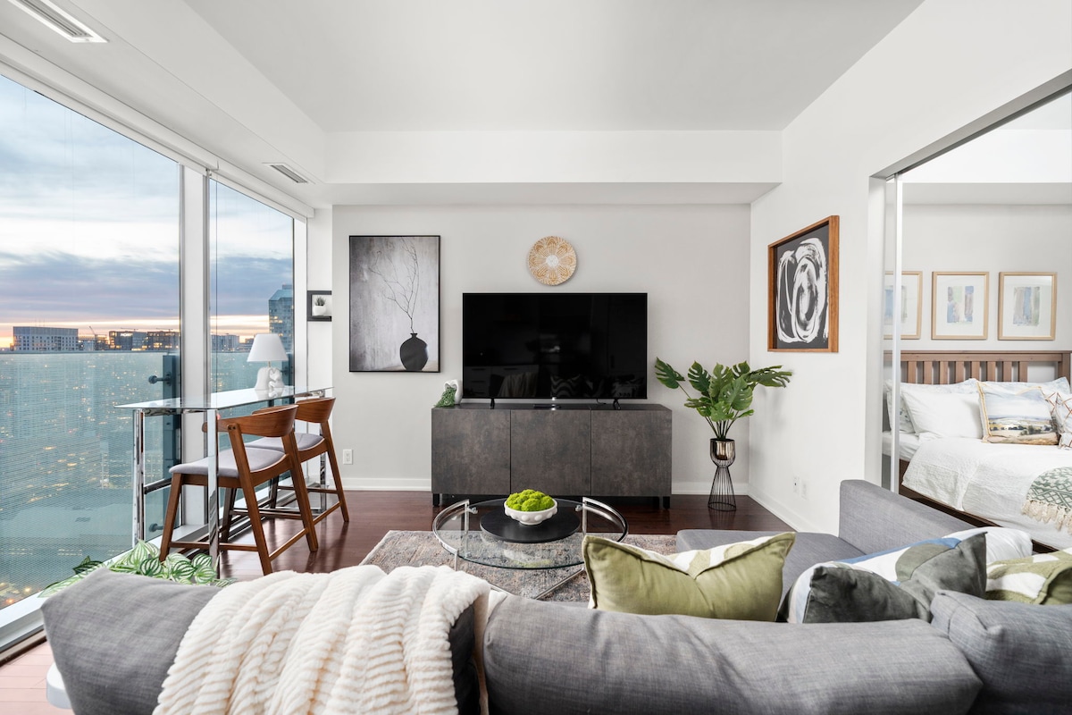 Entra en el moderno y elegante apartamento de 1 dormitorio y 1 baño en el piso 40+ en el corazón del centro de Toronto. Promete impresionantes vistas panorámicas de la Torre CN, el Rogers Center, el pintoresco lago y mucho más. Explora la ciudad antes de retirarte a esta hermosa joya cuyas vistas de un millón de dólares y una rica lista de servicios te dejarán asombrado. Vistas ✔ panorámicas a la ciudad y al lago. Dormitorio ✔ cómodo. Sala de estar de diseño✔ abierto. Cocina ✔ Totalmente Equipada ✔ Smart TV Wifi de✔ alta velocidad. ✔ Lavadora/secadora ¡Ver más a continuación!