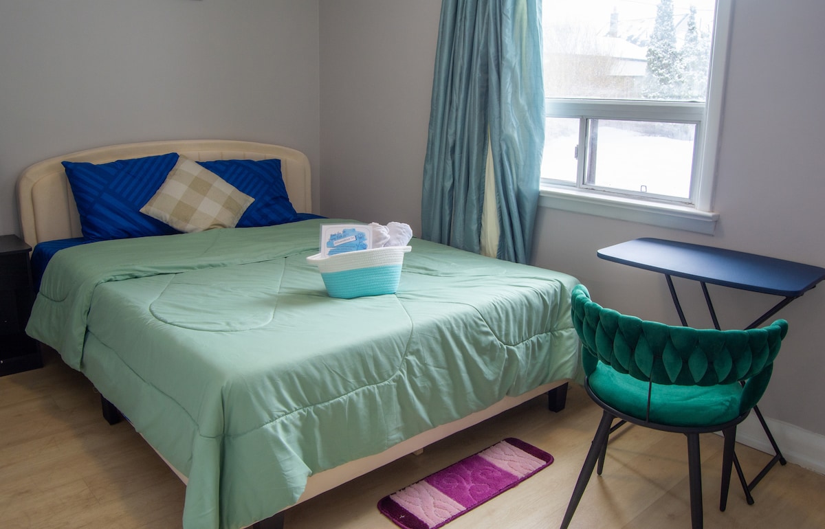 “Where Comfort meets Care” This luxury basement suite comes fully furnished with all the amenities you need. It is centrally located and has three private work or study spaces. The two bedrooms are spacious, with each having its own separate washroom for your privacy. There is an additional queen-size built-in pump auto-inflate Air mattress beside the king-size and queen-size beds for more convenience and comfort. The group would love smart TVs with full cable subscriptions and fast 5G internet.