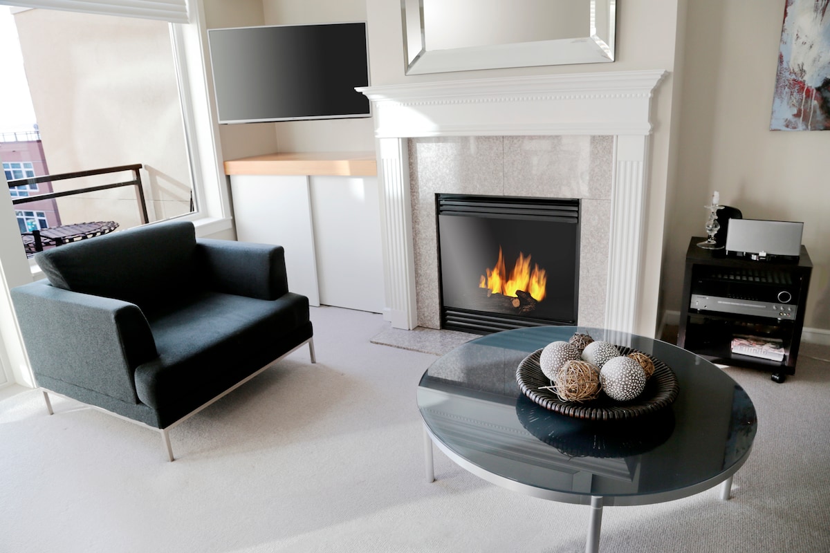 Mantente caliente junto al fuego, ya sea en los asientos incorporados alrededor de la hoguera o en el interior, en el sofá modular junto a la chimenea de gas lineal debajo del marco de TV Samsung. También en el interior hay ventanas del suelo al techo, calefacción por suelo radiante y detalles de vigas a la vista. El apartamento cuenta con una impresionante sala de estar de planta abierta con una cocina bien equipada, además de dos baños con una lujosa ducha de efecto lluvia.
