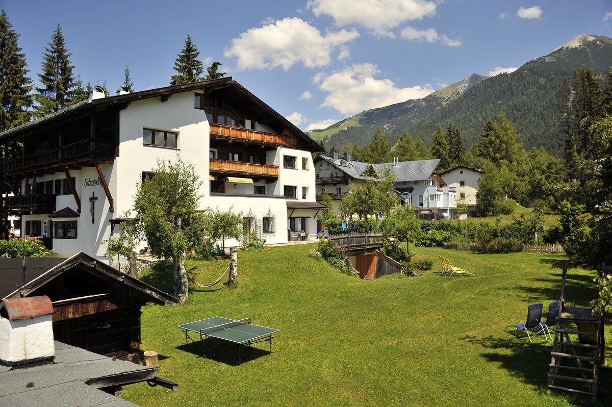 Acogedor apartamento de 2 habitaciones (salón y dormitorio) Un gran jardín, parque infantil natural, zona de barbacoa, tumbonas, mesa de ping-pong, columpios. TV por cable, sala de esquís,... Apicultura propia, nuestras abejas viven alrededor de Seefeld Hay 3 apartamentos en esta categoría: en la planta baja y en la primera y segunda plantas. piso (balcón o terraza) Tenemos pollos y ovejas, por lo que no se permiten mascotas