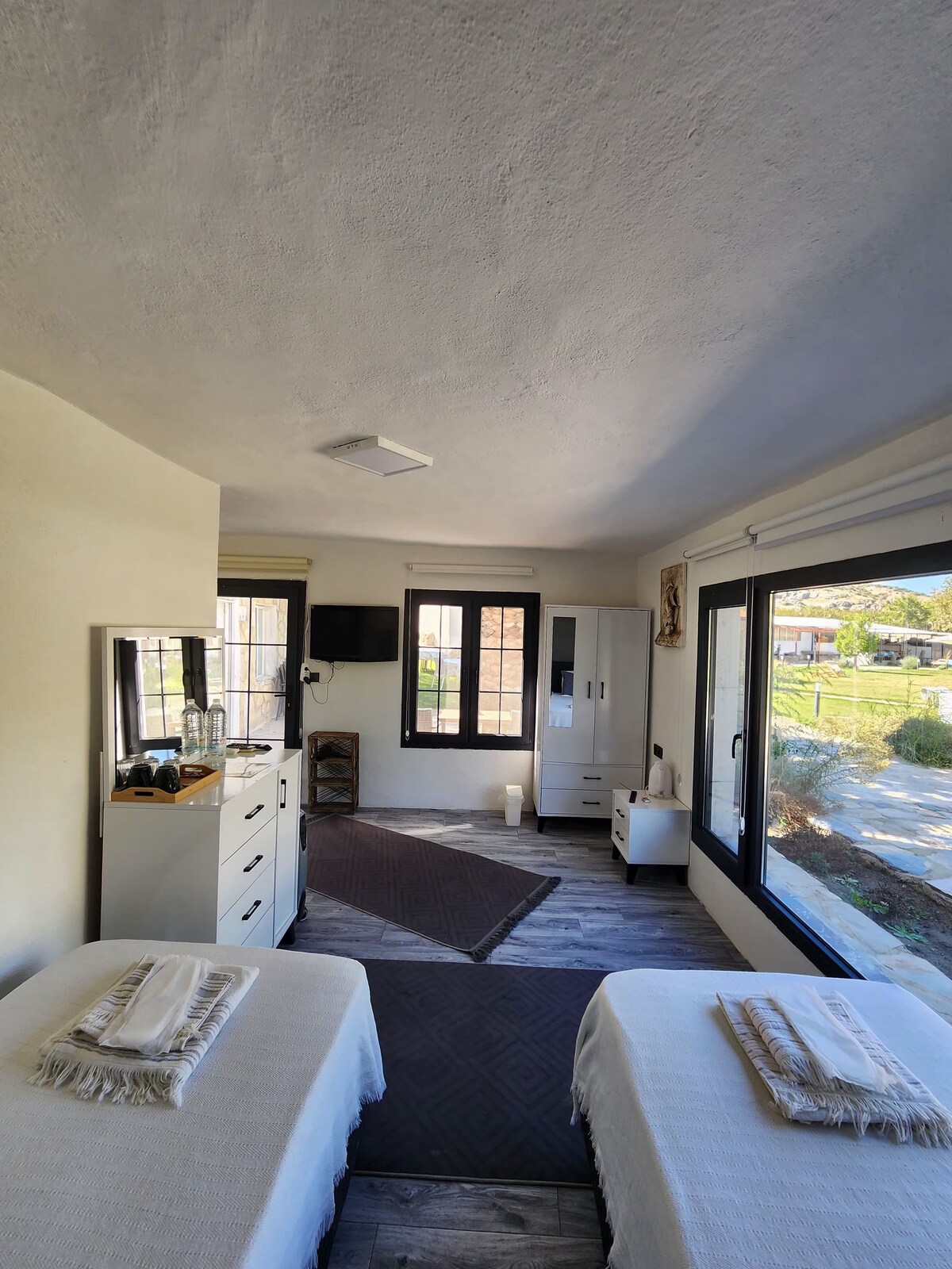 Stay in nature just 2 km from Ephesus. Our bright and comfortable 17 m² twin room is ideal for two guests. Surrounded by pine trees and greenery, it offers a peaceful atmosphere while being close to Selçuk center. Each morning we serve a traditional Turkish breakfast prepared with mostly homemade products, including homemade jams, local cheeses, fresh eggs, and seasonal ingredients, enjoyed in our garden restaurant area. Free parking. Pamucak Beach 11 km. Izmir Adnan Menderes Airport 65 km