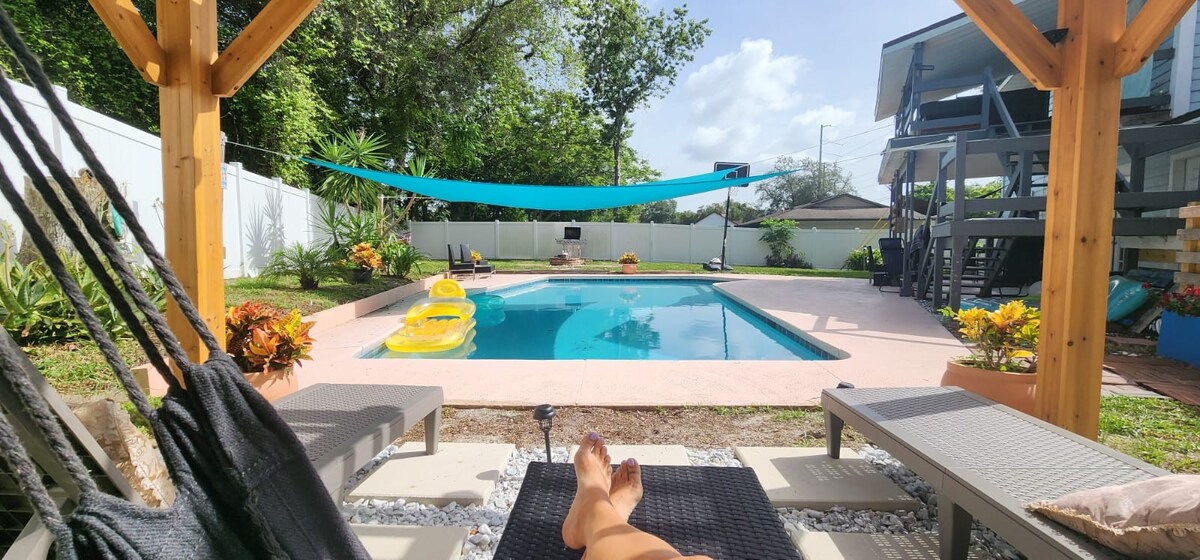 Un oasis acogedor, moderno, relajante y divertido convenientemente ubicado cerca de la I-4 aeropuerto senderos para bicicletas manantiales playa y ciudad Esta unidad independiente proporciona acceso a todo el patio trasero: piscina, pérgola, fogata, parrilla y juegos. Esta ubicación está a 5 minutos del manantial más cercano y de la rampa para barcos al lago Monroe. A 35 minutos de Daytona A 45 minutos de los parques temáticos (Disney, SeaWorld, Universal) La unidad incluye cocina completa, ducha de hidromasaje, TV en el salón y el dormitorio, y una diana.