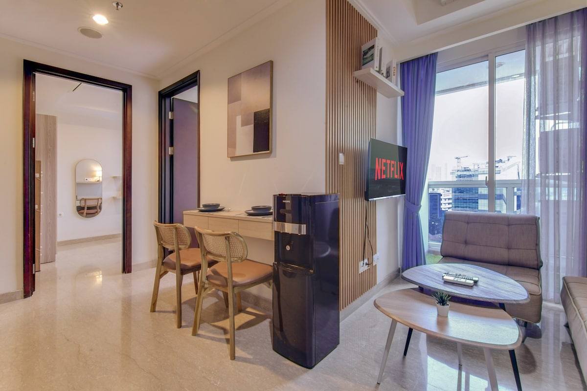 An elegant 24sqm studio in Jakarta's center, blending style and convenience. Includes kitchen, fast Wi-Fi, air-purification, 43" smart TV, sound system and Netflix. It is ideal for various stay types, with contactless access and amenities like pools, jacuzzi, gym, and basketball, Now features a Reverse Osmosis dispenser & food waste disposal, The picture shows a gas stove that has been replaced by an induction cooker (to follow the apartment guidelines for fire hazards)