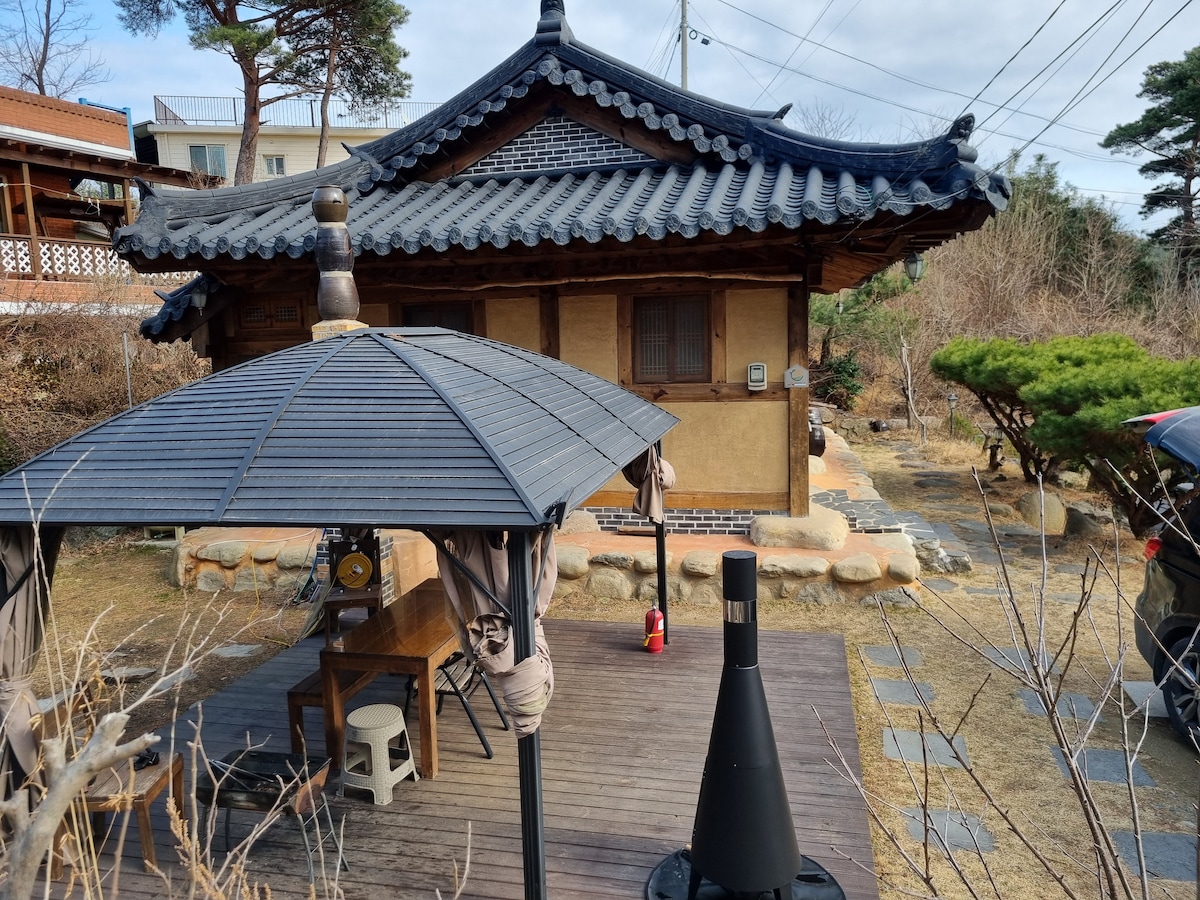 Este es un alojamiento hanok de 20 metros cuadrados en el bosque junto al mar, una casa privada hanok, Bulsol Pension. Sala de estar y habitación grande 1, habitación pequeña 1, aseo 2, espacio para hasta 5 personas, y el precio se basa en 2 personas. Mantas gruesas con suelo radiante, a 5 minutos a pie de la playa de Seorak, cerca de la ciudad de Sokcho, el puerto de Daepo y Naksansa. Como tienda de conveniencia, está a 3 minutos en coche de Ganghyeon Hanaro Mart, a 2 minutos de Naksan Branch y a 10 minutos en coche del centro de Sokcho en Yangyang. Puedes practicar surf en lugares como Mulchi, Jeongam y Seorak Beach. Después de un viaje por el mar, puedes relajarte en un tranquilo hanok de pino y ver las estrellas al final de los aleros. El dormitorio no tiene cama y está climatizado. Se puede cocinar fácilmente en la cocina, pero absténgase de cocinar alimentos malolientes, ya que el aroma a pino del interior puede desaparecer. Puedes comer en la mesa de comedor para 6 personas en el comedor exterior. Hay parrillas de fundición en el equipo de barbacoa y boosta. El gas butano de la parrilla de carbón debe prepararse por separado. Disfruta de un descanso en familia en un hanok tradicional con un sutil aroma a pino.