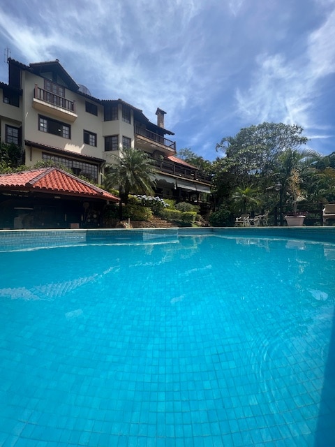 Casa de 400 m2 en una zona con acceso controlado por una caseta de vigilancia, con la paz y tranquilidad que la región montañosa de Teresópolis puede brindar y numerosas actividades de ocio, dentro y fuera de la propiedad Piscina, parrilla, horno de pizza, mesa de cartas y juegos de mesa, mesa de billar y pantalla para ver películas en varios "streamings" y para ver su partido deportivo favorito. Televisores en las 5 suites de la casa y en la sala de estar. Senderos y cascadas dentro y fuera de los parques nacionales.