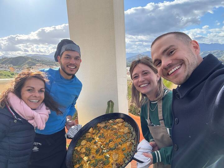 España en un plato. Auténtica paella cocinada en vivo en tu villa con ingredientes locales y ecológicos. ¡Mira la magia! El menú tiene algunas tapas, paella y postre cremoso.
