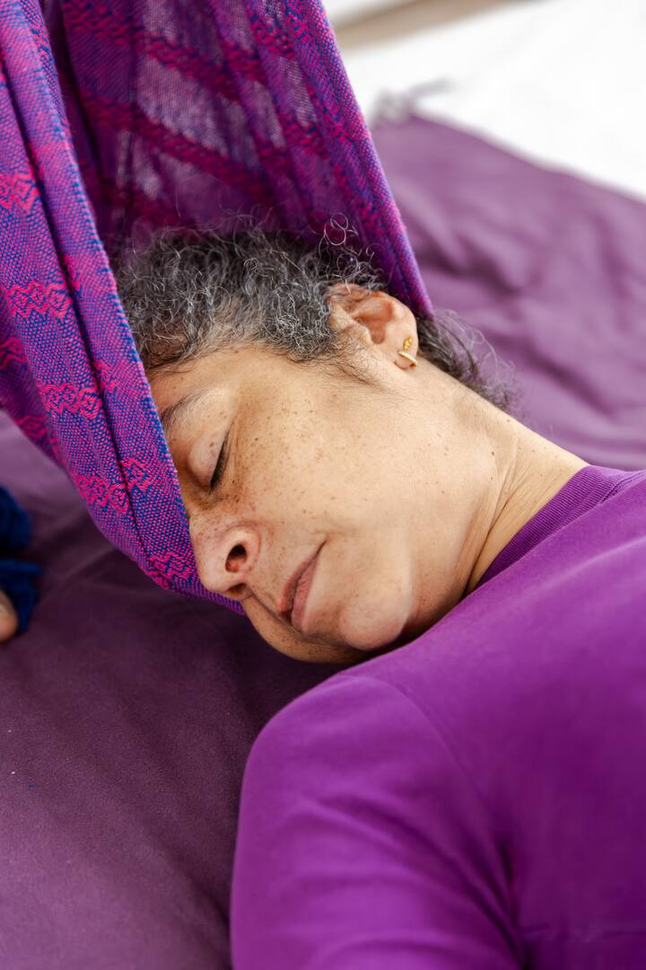 El masaje con pañuelo es un enfoque suave y envolvente que utiliza tejidos para sostener y acompañar el cuerpo de manera segura y no intrusiva. La sesión combina balanceos, estiramientos suaves y movimientos envolventes para favorecer la relajación de las tensiones y el apaciguamiento del sistema nervioso. Este tratamiento está indicado en caso de estrés, fatiga nerviosa o sobrecarga emocional. Recibir un masaje con pañuelo es darse un tiempo de descanso, apoyo y reenfoque.