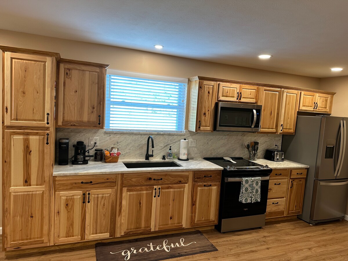 The Old Home Place is a modern-rustic farmhouse that features two bedrooms with queen size beds, a loft with a twin daybed, with an additional twin trundle bed. The couch in the main living area pulls out also, making a full size bed. A full bathroom is on both floors, a fully stocked kitchen and full size laundry appliances. Don't forget to enjoy the screened-in porch and the fire pit. We have plenty of nice, level space for parking, including motorcycles and trailers.
