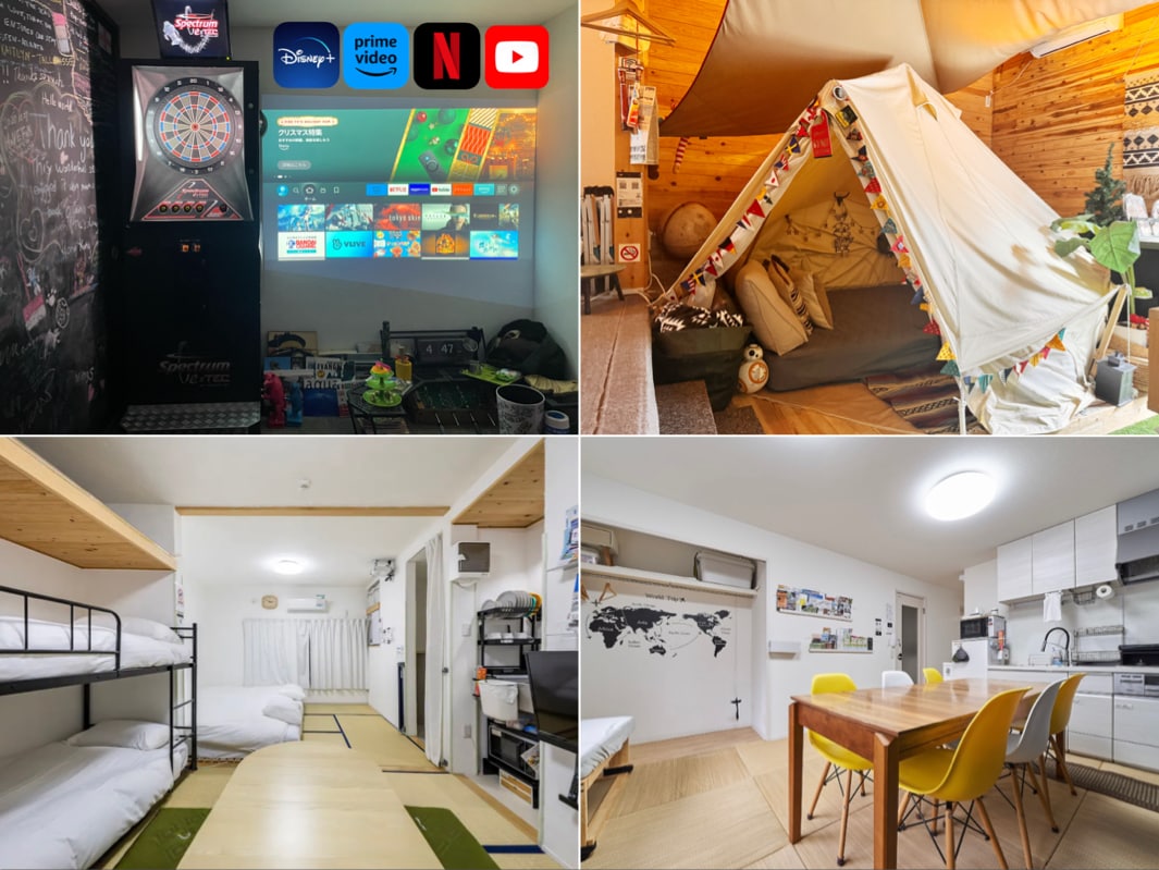 ¡Gracias por su interés en este alojamiento! Hasta 4 personas pueden alojarse sin cargo adicional, con limpieza incluida, y el precio es muy fácil de entender (la tarifa de servicio de Airbnb es independiente) El primer piso tiene especificaciones para acampar en el interior, y hemos proporcionado tiendas de campaña glamping, hamacas de silla, máquinas de dardos, juegos en pantallas grandes, cartas para ver películas [NetflixDisney + Amazon], juegos de mesa y 40 tipos de juegos de mesa, por lo que no hay duda de que puedes disfrutar de una estancia diferente a la habitual. Desde el uso de viajes turísticos, fiestas de chicas, viajes de graduación, reuniones de clubes, fiestas de cumpleaños, etc., el estadio Mazda también está cerca, por lo que a menudo se utiliza para ver béisbol. Además, está cerca de la estación de Hiroshima, por lo que es un lugar muy conveniente para ir a lugares de interés.WiFi portátil está disponible para hacer turismo Creo que lloverá si vienes a Hiroshima para un viaje, pero es agradable tener un lugar para disfrutar en tu habitación. El barrio está lleno de farmacias, tiendas de comestibles, supermercados, restaurantes, karaoke, billares, etc. que venden comida y alcohol. Tiene capacidad para 12 personas