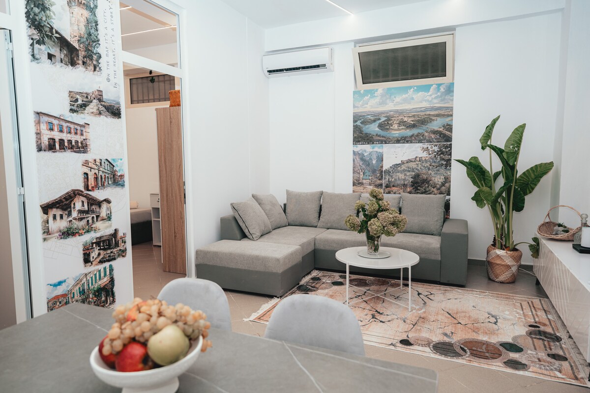 Este apartamento está en el centro de la ciudad, a 100 metros de la carretera más antigua de esta ciudad. Cuando estás en el balcón puedes ver la catedral más grande de Shkodra. Puedes encontrar todo cerca, como un restaurante de mariscos que está a 50 metros, el mercado a 30 metros y un buen restaurante tradicional a 100 metros. Este es el lugar perfecto para que se alojen 2 personas. También tenemos bicicletas en alquiler.