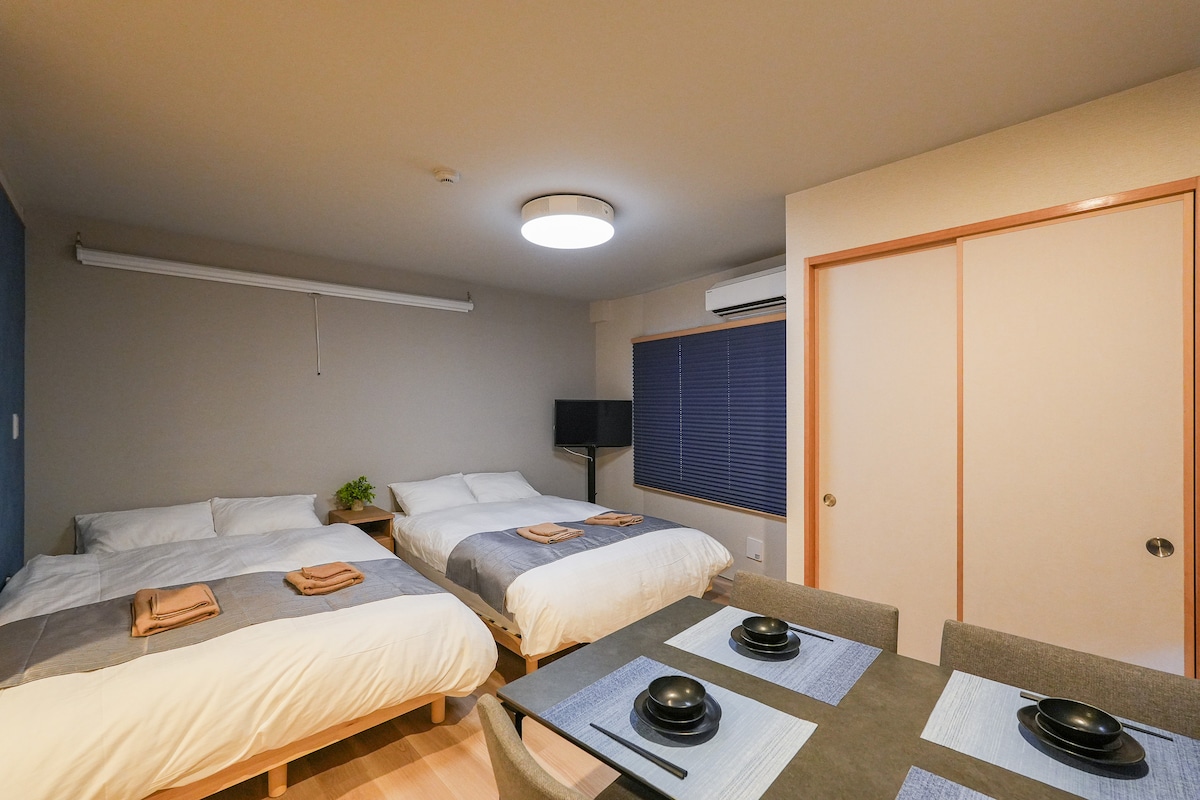 Es conveniente para toda la familia ir a cualquier lugar en este lugar céntrico. Dos camas tamaño «king» en la habitación, adecuadas para familias y amigos El suelo es cómodo y el espacio es privado.Apto para un máximo de 5 personas. La cocina abierta está totalmente equipada con cocina de inducción, ollas y platos, si quieres comer comidas caseras, la cocina japonesa sencilla no es un problema. La barra está conectada al salón y al comedor, ya sea un café por la mañana o una cena, todo está bien. El fregadero está diseñado con un baño separado, por lo que puedes quedarte con algunas personas a tu propio ritmo Disfrutar de música con un estéreo Bluetooth y darse un baño caliente por la noche en Japón es el momento más relajante del viaje. Hay un proyector en la sala, por lo que puede conectar fácilmente la plataforma de transmisión digital de uso común Lavadora, purificador de aire, plancha y armario espacioso, lo que necesites, estamos listos El espacio es perfecto para que una persona trabaje tranquilamente en el bar o se quede con amigos o familiares durante unos días. Estar en casa, cada uno cómodo.
