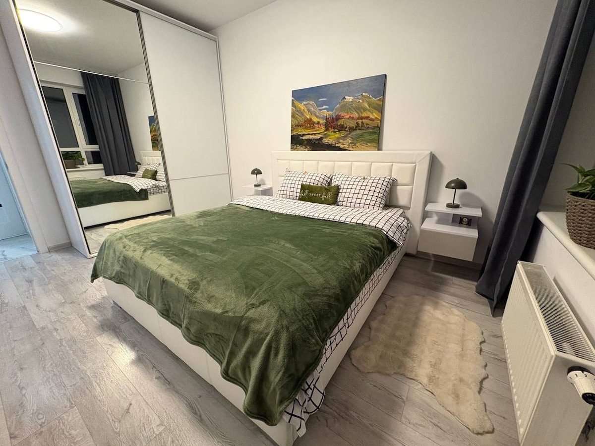 Estimado huésped: ¡Te invitamos a organizar días felices en nuestro apartamento ! Nuevo complejo residencial 2018 , octavo piso cerca de la estación de metro Polytechnic Institute. Sala de estar - cocina con sofá plegable, dormitorio con cama 180*200 , balcón, aire acondicionado, estufa eléctrica, horno, microondas,campana, Wi-Fi, lavadora, secador de pelo, hervidor eléctrico, plancha, vajilla. La casa tiene seguridad, videovigilancia, patio cerrado con campo para niños y deportes Centro comercial Smart Plaza, KPI Park, centro comercial Ucrania, circo, zoológico, zoológico , estación de tren